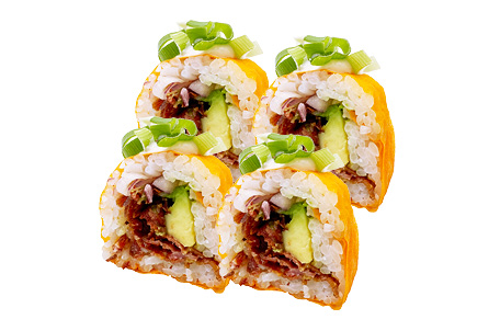 rote Zwiebeln, Avocado, Mayonnaise in Soja-Nori mit Spicy Mayo und Frühlingszwiebeln