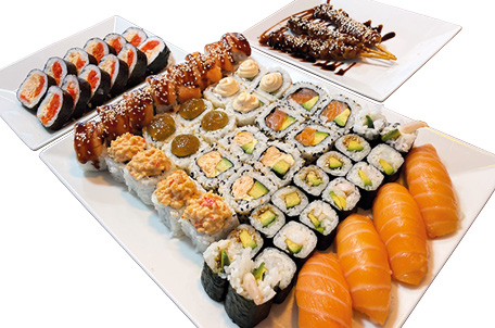 4 x Nigiri, 16 x Hoso Maki, 12 x Futo Maki, 28 x Ura Maki, 3 x Yakitori, Wasabi, Sojasauce