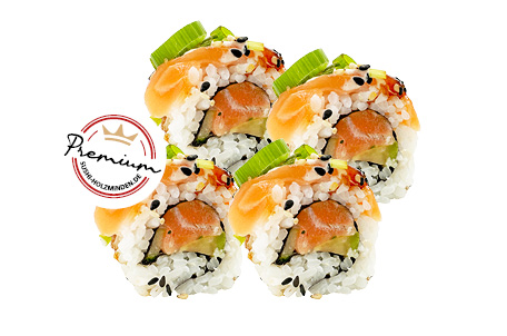 roher Lachs, Avocado, Gurke, Sesam, Mayo, Teriyaki-Sauce, Frühlingszwiebeln